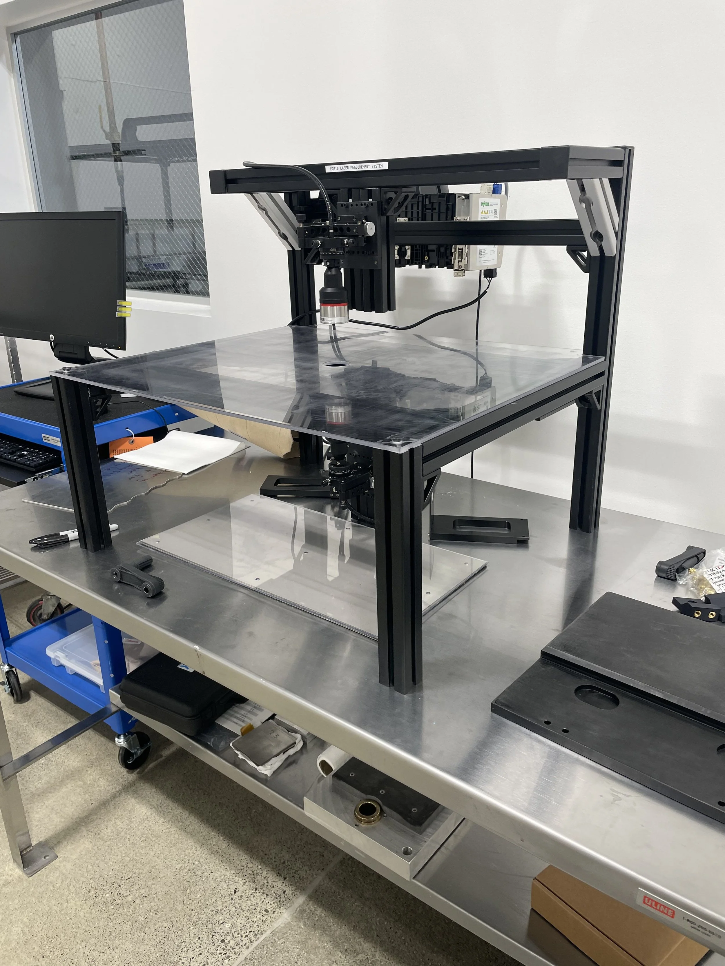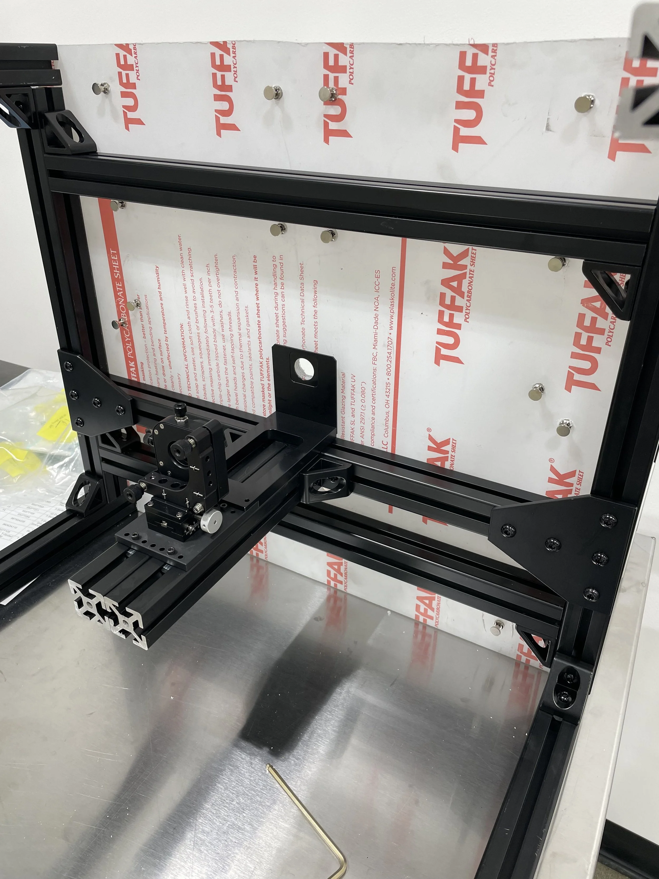 Because we wanted to set up the CL-3000 as fast as possible, I opted to design everything with aluminum extrusions. I chose black anodized extrusions to make it look professional and clean. I designed the fixture using SolidWorks, created drawings for each part, and cut all the pieces myself on our vertical bandsaw.